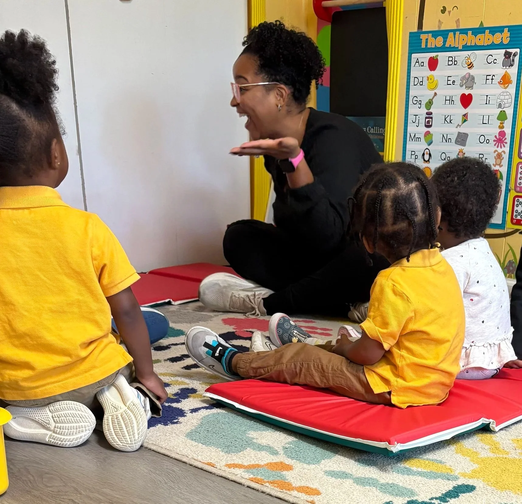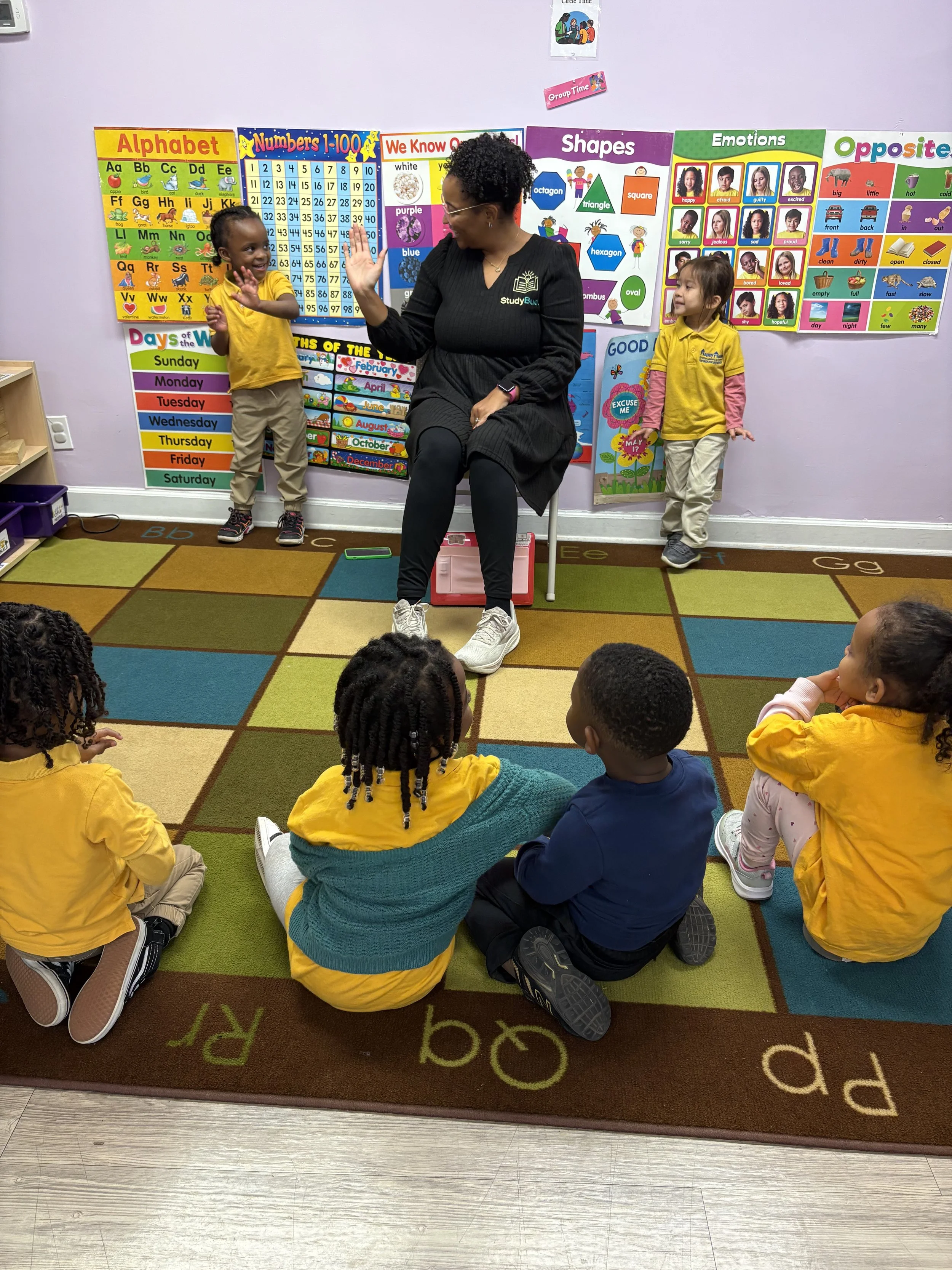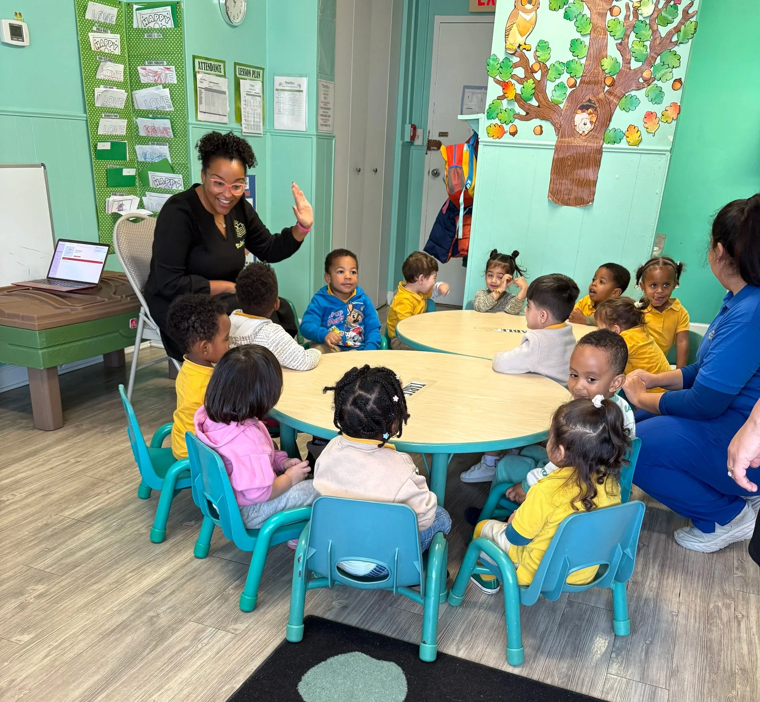 Students are introduced to Spanish through music, movement, repetition, and interactive play in a way that fits naturally within a daycare setting.